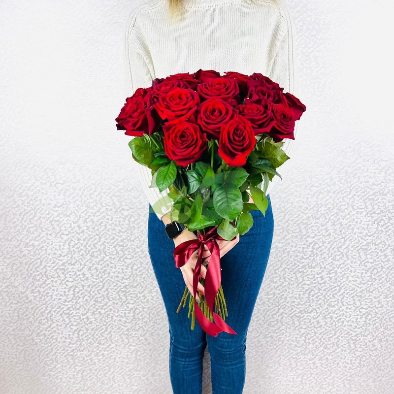 • Роза - 21 штука, цвет - красный, длина стебля - 60 см;