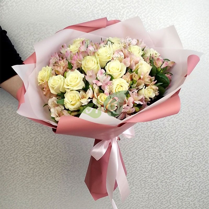 Изящный букет “Парижанка” – это свежие белые розы и розовые альстромерии в композиции на заказ с доставкой. Благодаря объемности роз и альстромерии этот букет нельзя назвать маленьким.
