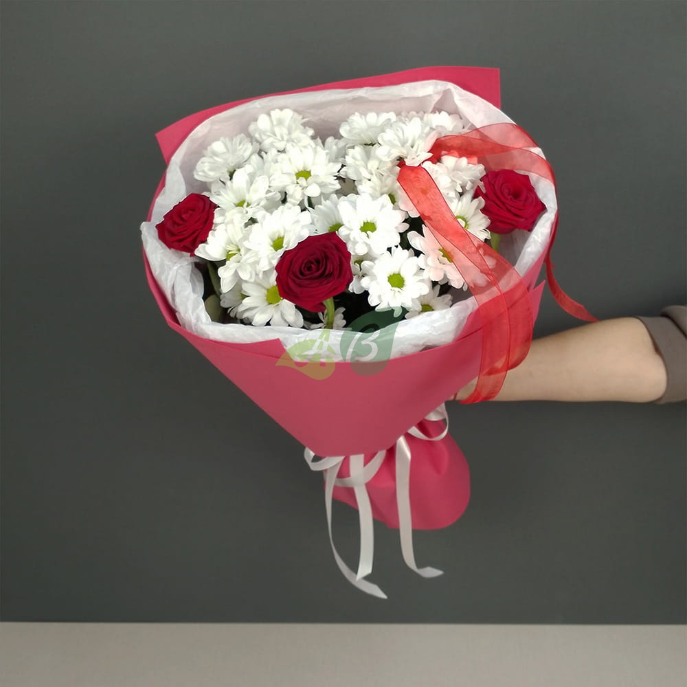 Сборный букет из белых хризантем и красных роз